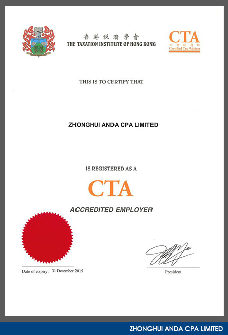 ZHONGHUI ANDA CPA Limited is registered as a "CTA ACCREDITED EMPLOYER" of The Taxation Institute of Hong Kong.